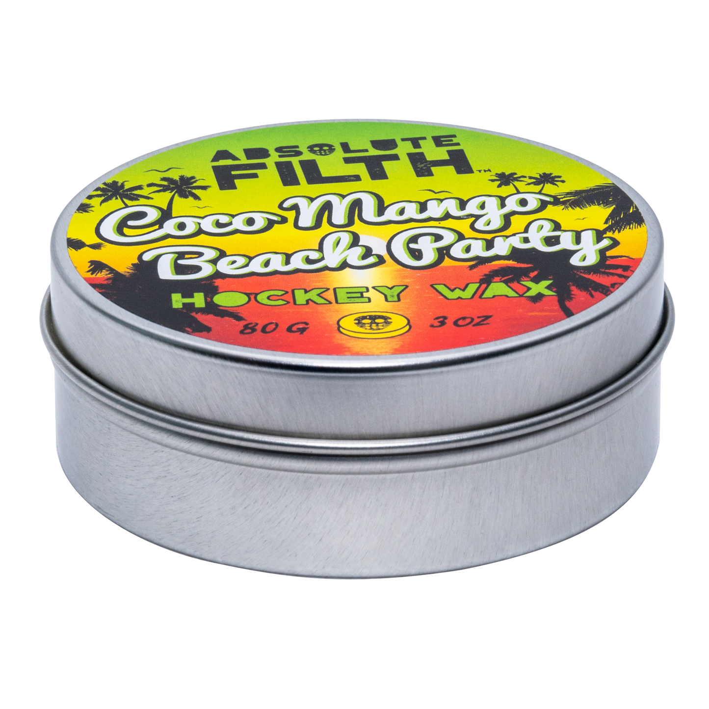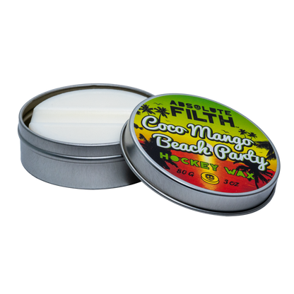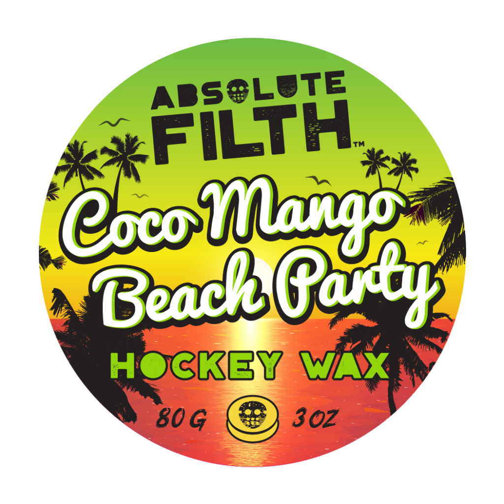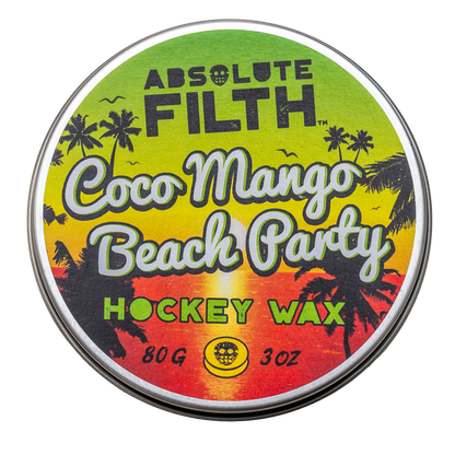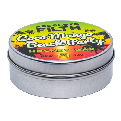 Like all Absolute Filth waxes, Coco Mango Beach Party uses our blend of all-natural waxes. Each is chosen for a specific purpose, to make your tape last, and to give you command and control over the puck. Protected by our famous screw top tin your Coco Mango Beach Party will always be nice and clean, sand and grit belong on the beach not your hockey wax.